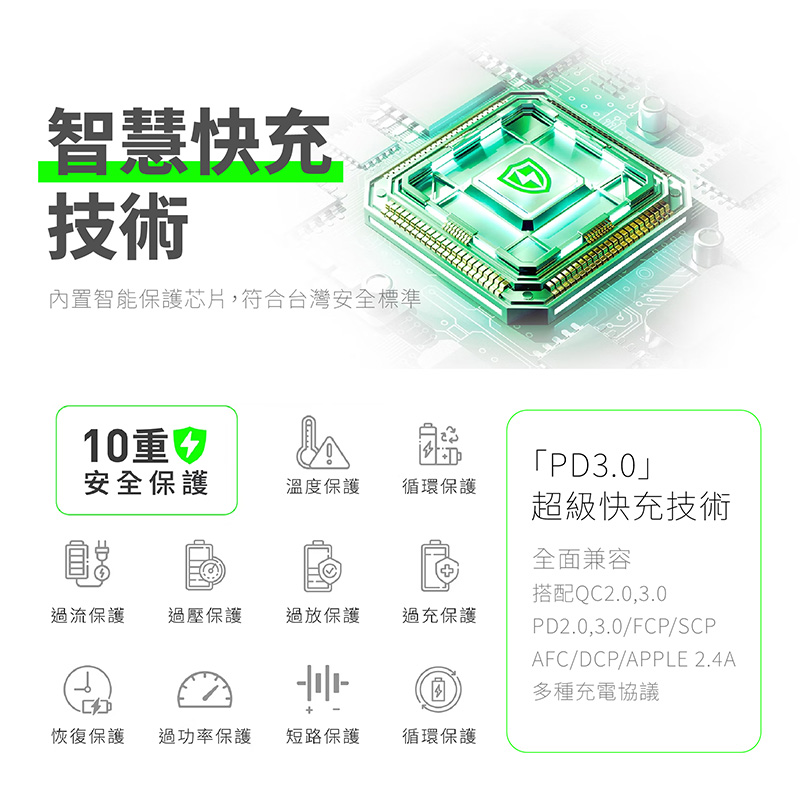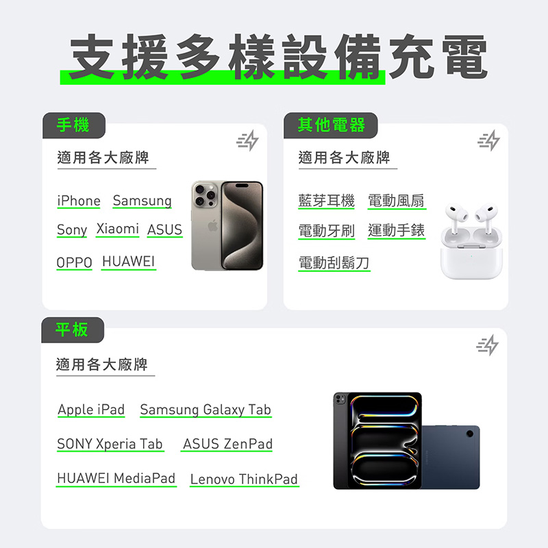 - 雙口輸出(USB + Type-C),同時為兩個設備充電