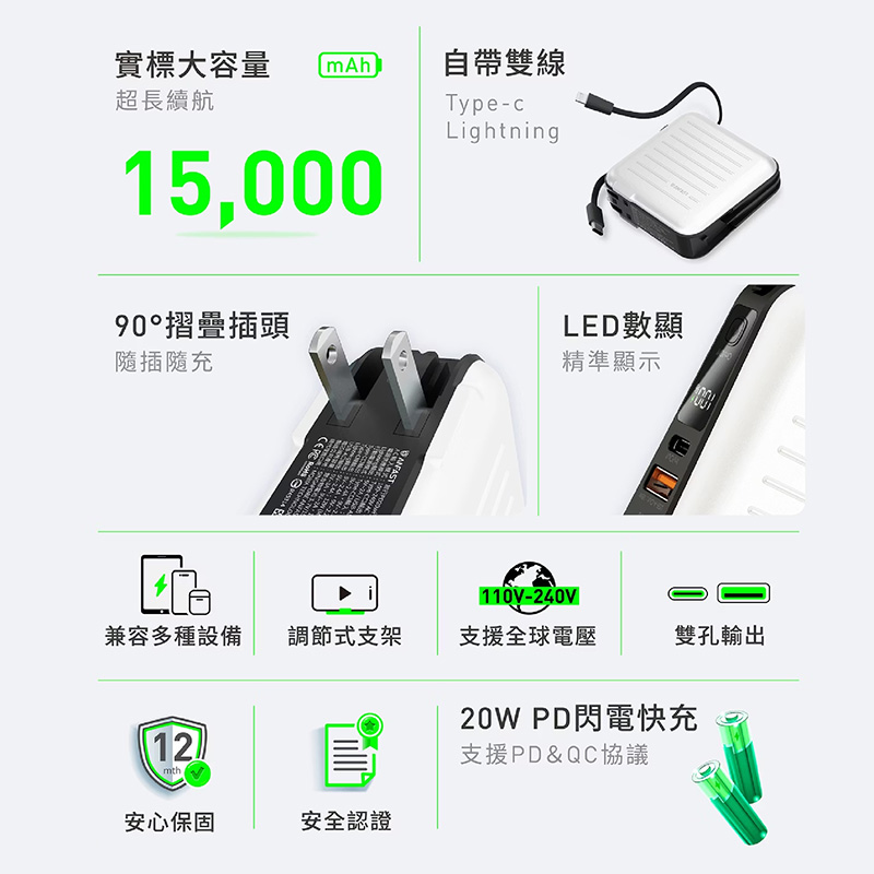 - 超大容量15000mAh,充電無憂