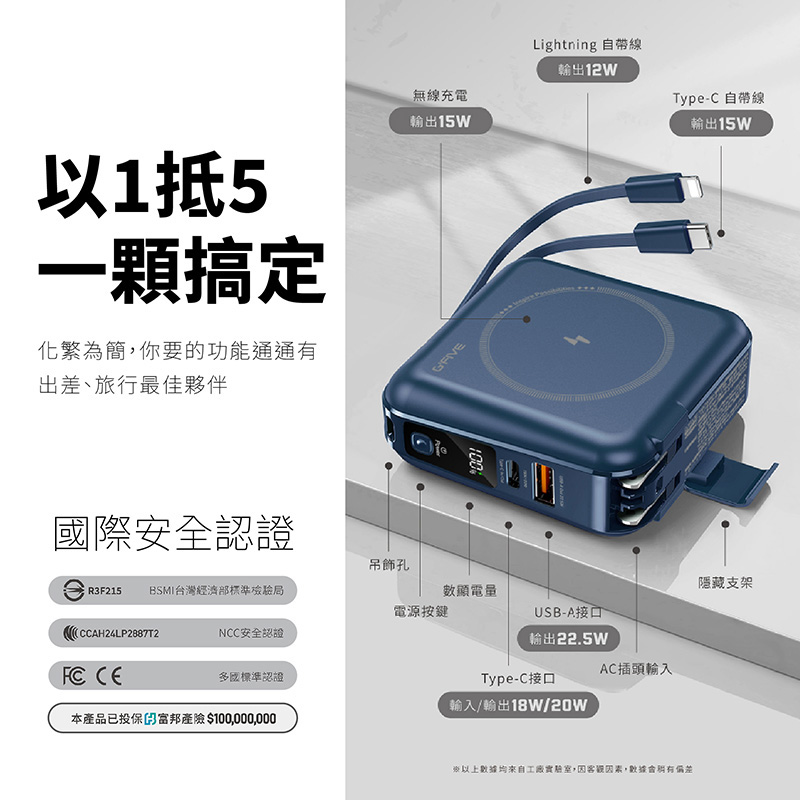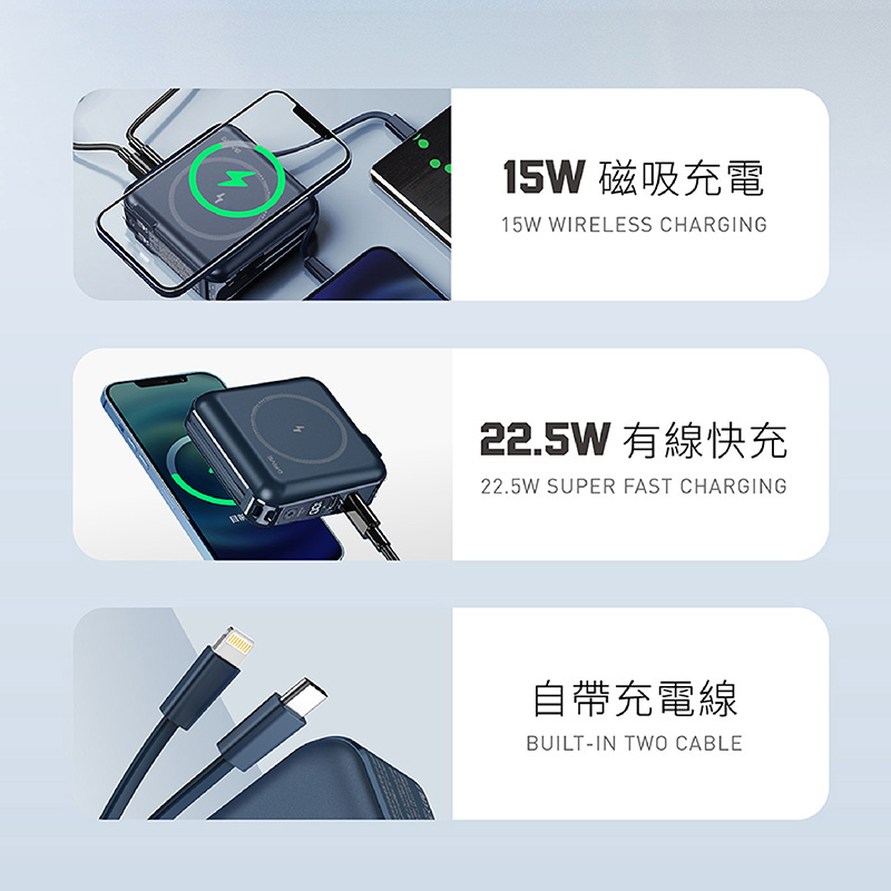 - 22.5W快充:搭載USB-A與Type-C接口,支援PD/QC快充